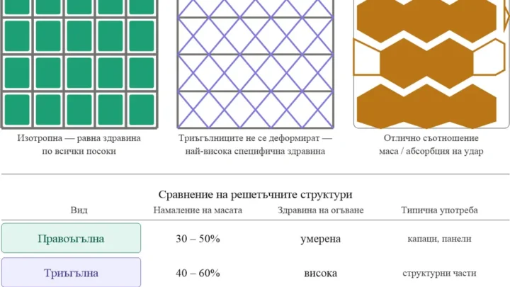 Ето визуализация на трите основни решетъчни структури и как се разпределят натоварванията в тях: Какво представлява решетъчната структура? Решетката замества плътна зона от материал с мрежа от тънки греди и отвори. Ключовото прозрение е, че материалът в средата на дебела стена почти не допринася за здравината — натоварванията се поемат основно от повърхностните слоеве. Решетката…