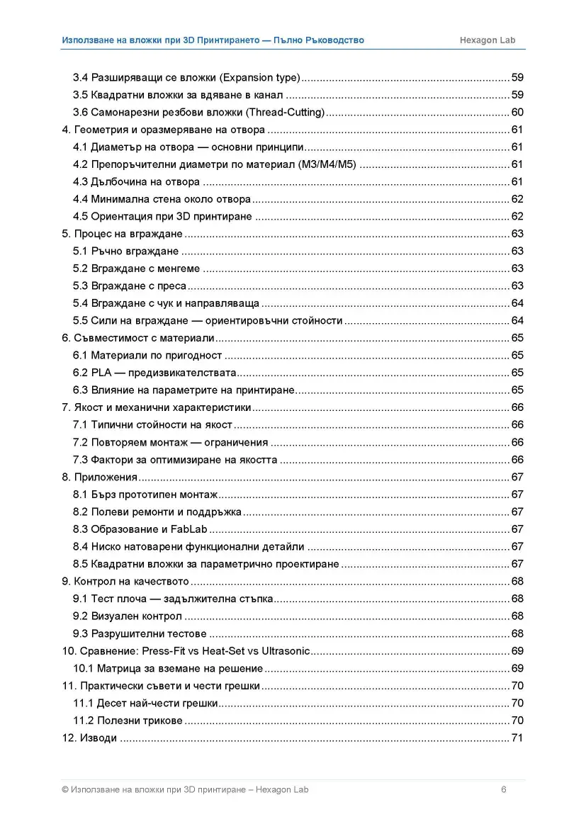 Петте модула от тази учебна серия изграждат пълна и практически приложима картина на технологиите за резбови вложки при 3D принтиране. От простото пресово вграждане с нулева инвестиция до прецизното ултразвуково вграждане при масово производство, и от превантивното укрепване до ремонта на повредени резби — серията покрива пълния спектър от нужди на съвременния инженер и техник.
